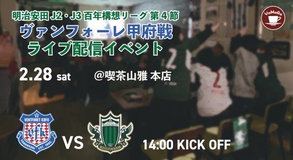 【喫茶山雅】2/28(土)アウェイ・甲府戦「ライブ配信イベント」開催のお知らせ