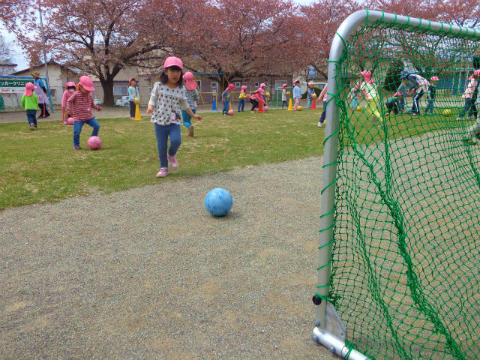 4月27日(木)松本市岡田保育園の年長さん約50名を対象に巡回指導を行い、松本山雅FCより加藤コーチと上原コーチが参加しました。