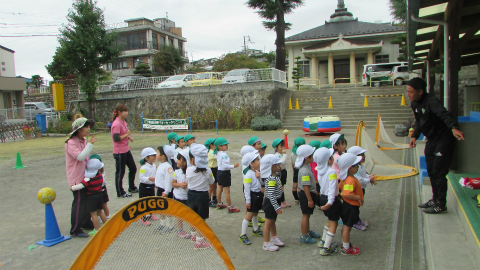 10月12日(木)松本中央幼稚園の年少さん25名を対象に巡回指導を行い、松本山雅FCより上原コーチと小林コーチが参加しました。