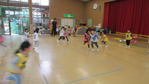 雨の影響で園庭が使えずホールでの開催でしたが、みんなとても元気に楽しくサッカーができました。