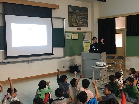この講座は授業の1・2時間を活用し、プロサッカー選手とは?を子どもたちに伝え、その後はみんなでサッカー教室を行う2部構成で行いました。