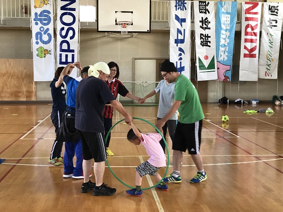 はじめに2グループに分かれ、フラフープをくぐるゲーム、声をかけないながらのパス練習を行いました。