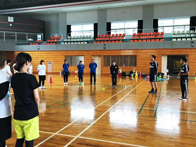 このイベントは、大町市が子育てに追われているママさんたちを対象に、一緒に体を動かすことでママ友づくりや気分転換になるようにと企画された「託児つきスポーツ教室」で、今回は松本山雅FCスポーツ講座を実施しました。