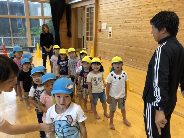8月30日(金)村井保育園の年中さん・年長さん2クラスを対象に巡回運動指導を行い、松本山雅FCサッカースクールコーチの藤本・原が参加しました。