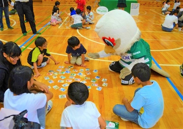 かるたの贈呈の前にガンズくんがステージから登場し、子どもたちは大変喜んでいました。