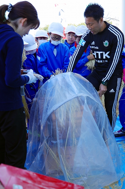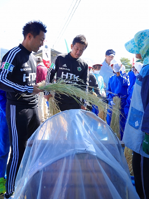 10月10日(木)JA信州諏訪様が主催する、「食農教育」の一環の米作りの一環で行われている岡谷市長地小学校で行われた脱穀に、松本山雅FCから鐡戸アンバサダー、小澤営業部チーフが参加しましたのでご報告いたします。