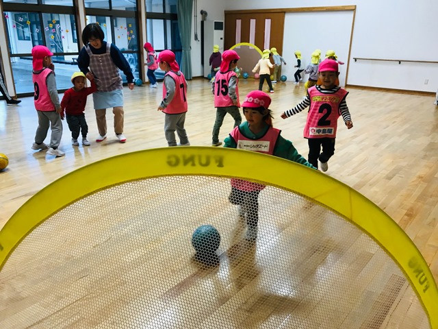 中にはとても上手にボールを止める園児もいて、片山ホームタウン担当も負けじとボールをしっかり止めていました。