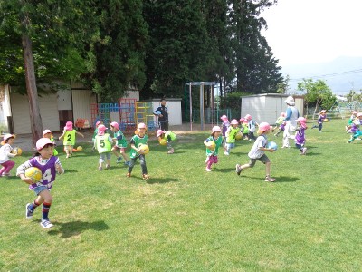 5月7日(木)安曇野市三郷北部保育園のゾウ組さん(年長30名)を対象に巡回指導を行い、松本山雅FCより久保コーチと小林容太コーチが参加しました。