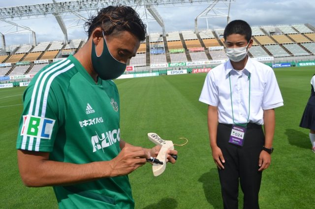 この日は修学旅行で中信地区を訪れた天龍中学校の3年生の皆さんが最終日に移籍加入選手分のハンガーを届けてくれました。