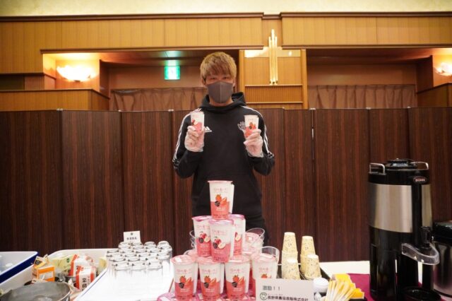 また、この日の夕食には長野県農協直販株式会社様よりチームに栄養をと差し入れていただいた、「信州産りんごドリンクヨーグルト180g 300本」「信州産いちごドリンクヨーグルト180g 300本」が並びました。