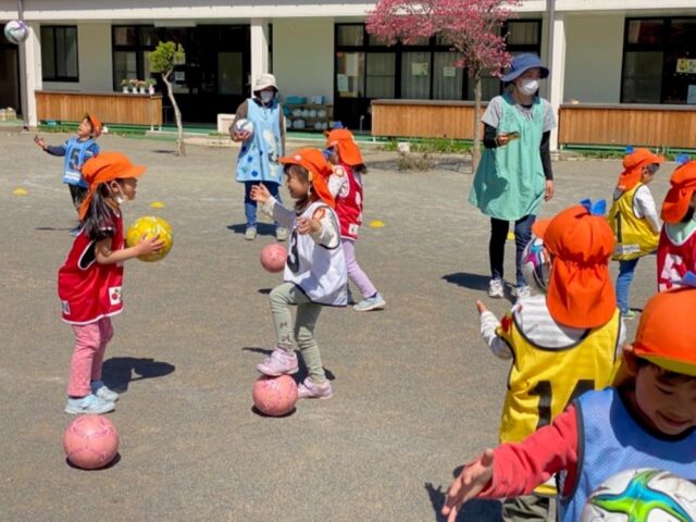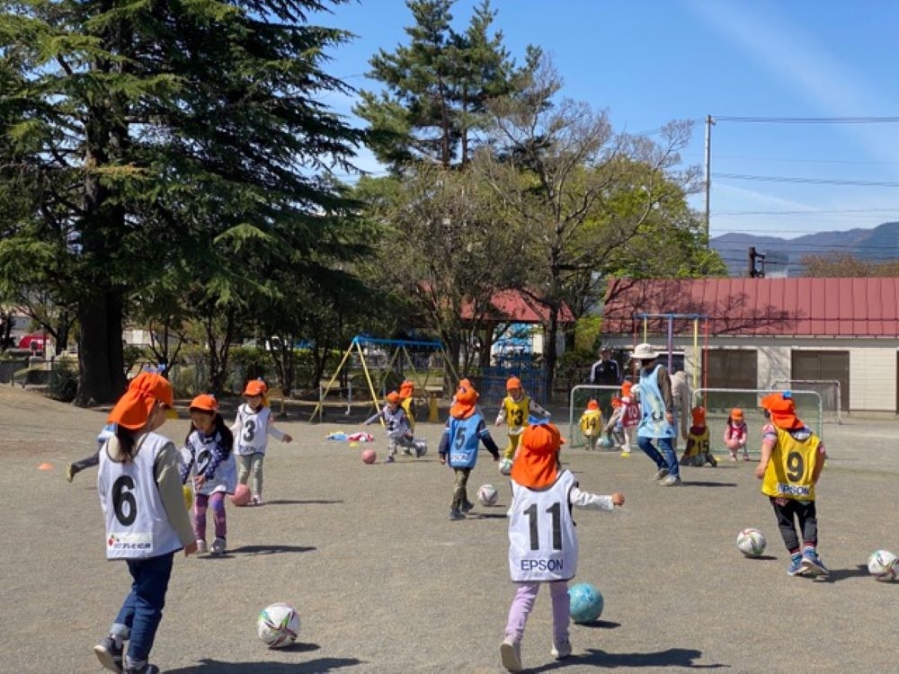 4月23日(金)松本市梓川東保育園の年長さん対象に巡回指導を行い、松本山雅FCスクールコーチの原と大野が参加しました。