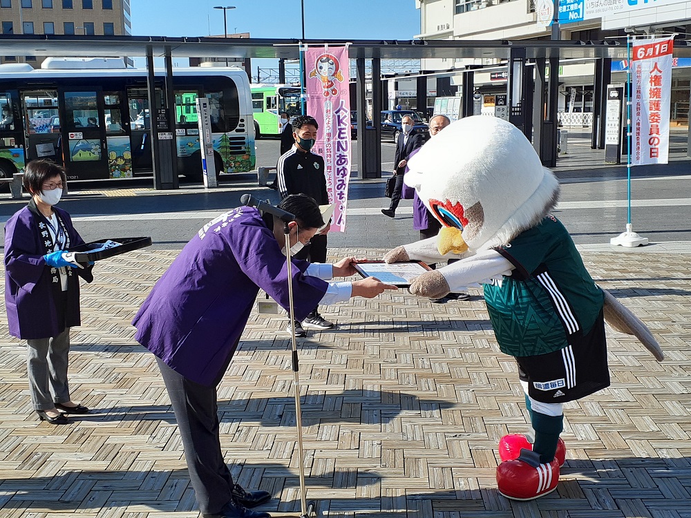 山本グラスルーツアンバサダーとガンズくんが一日人権擁護委員に委嘱され賞状をいただきました。