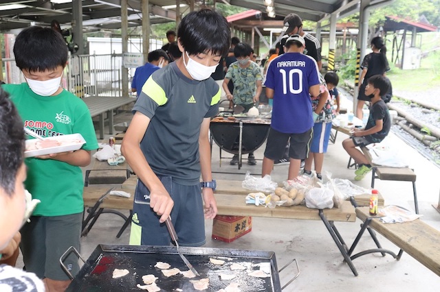 そしてお待ちかねのBBQの時間です。火起こしなどの準備から調理、食事、洗い物などの後片付けまで自分たちで行います。例年では完食できない量のお肉と野菜と焼きそばですが、今年の参加者の子どもたちは完食できました。また、後片付けも約45分で終了し、例年ではかなり早い片付けとなりました。みんなが協力してテキパキ行動できました。