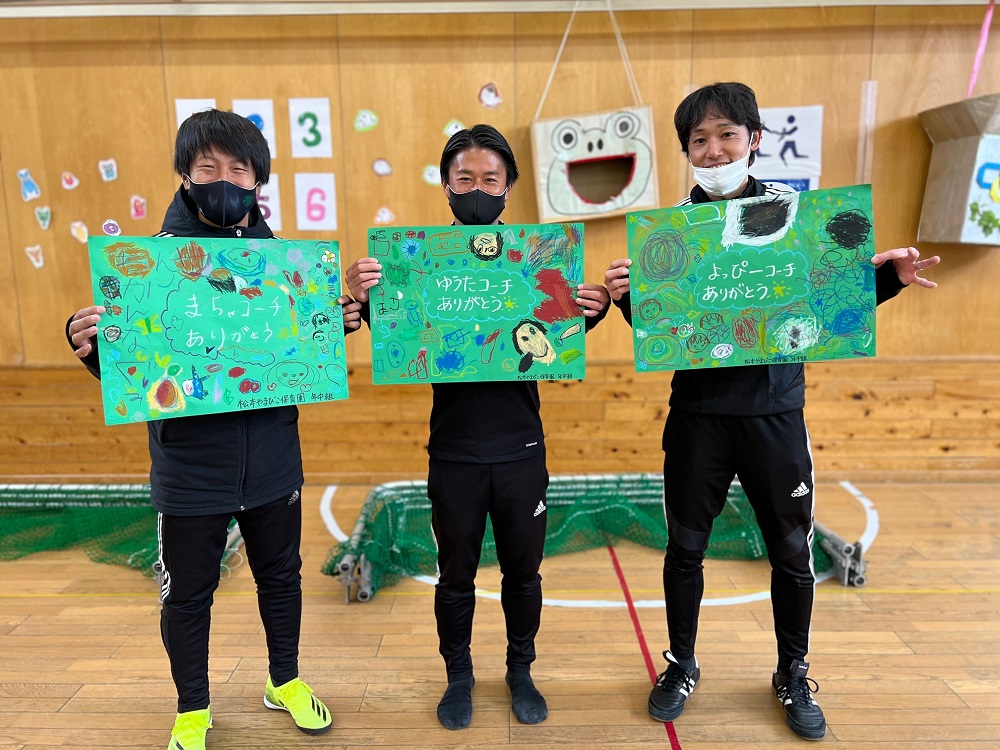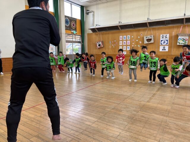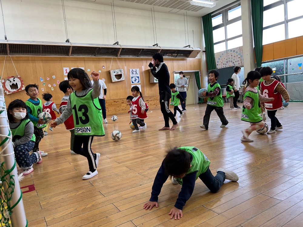 12月8日(水)松本市のやまびこ保育園の年中組を対象に巡回指導を行い、松本山雅FCユースアカデミースクールチーフの小林とスクールコーチの藤本と松本山雅FCレディースU-15コーチの小林陽介が参加しました。