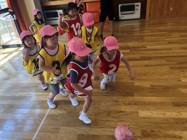 ボールを上に投げ、落とさないようにキャッチしたり、投げている間に頭やお腹をさわってからなど少しずつ難しくしましたが、みんな上手に行うことができました。