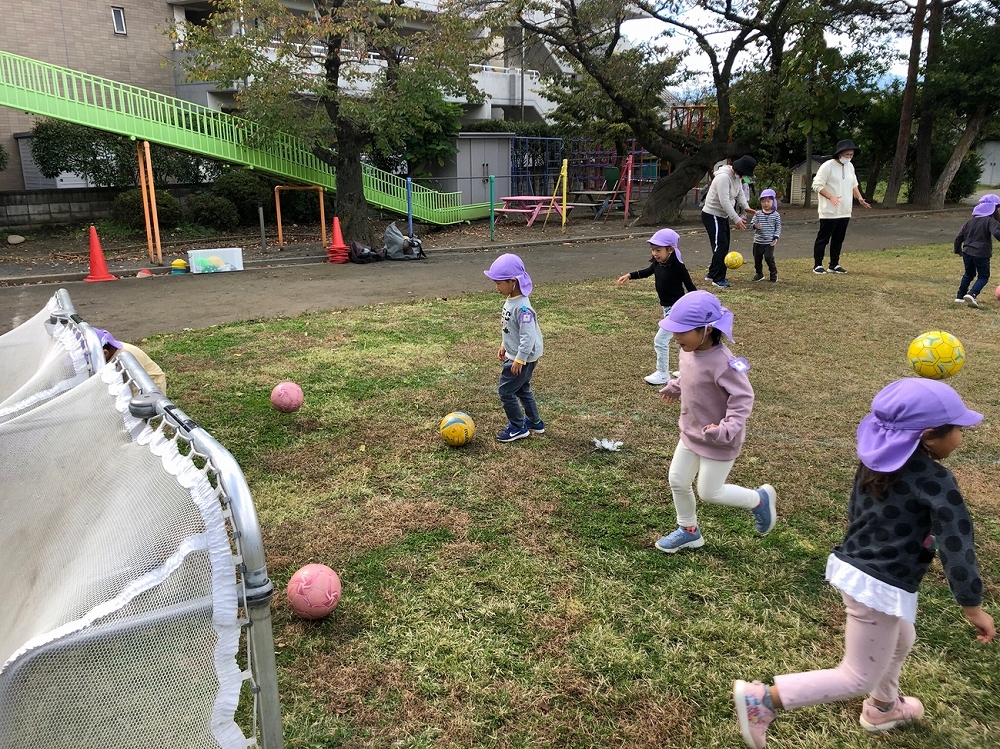 年中さんは「どいてどいてオニごっこ」から始まり、「忍者手裏剣」、「ボールを投げてキャッチ」、「ボールとお散歩」、「ゴールへシュート」を行いました。