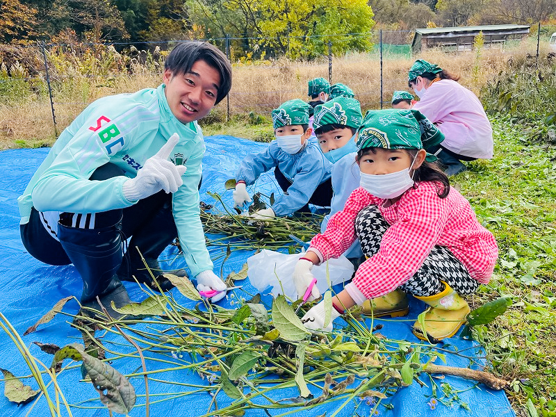 11月15日(火)に生坂村の畑で、今年6月に生坂保育園の園児のみんなと一緒に種まきをした青大豆「あやみどり」を収穫しましたので報告いたします。