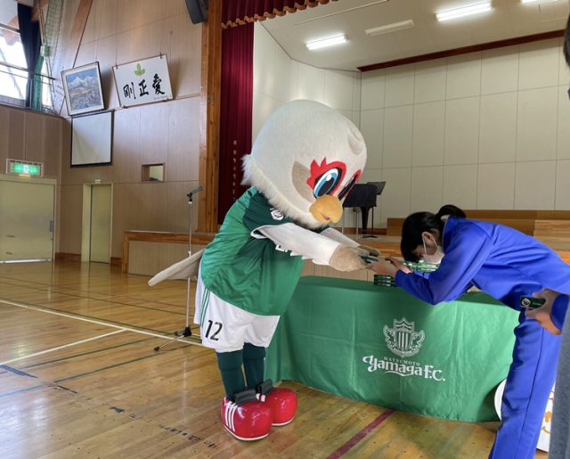 いよいよガンズくんが「松本山雅FC ガンズくん交通安全かるた」を寄贈するというところで、6年生がどこから登場するのだろうとキョロキョロしながら、大きな声で「ガンズくん!」と呼ぶと、体育館の扉を開けて、元気よくガンズくんが登場し、大喜びする子どもたちの姿が印象的でした。