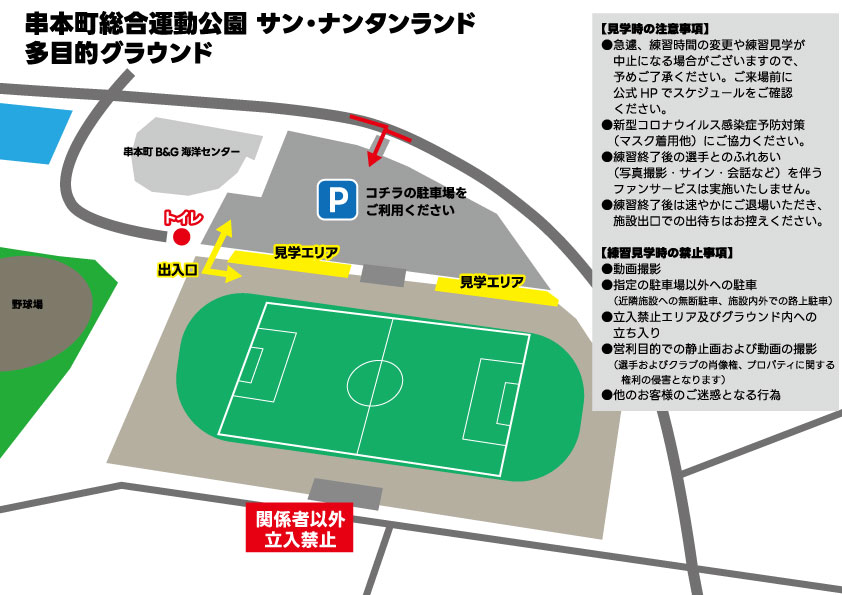 また、練習終了後の選手とのふれあい(写真撮影・サイン・会話など)を伴うファンサービスは実施いたしませんので、何卒ご理解のほどお願いいたします。