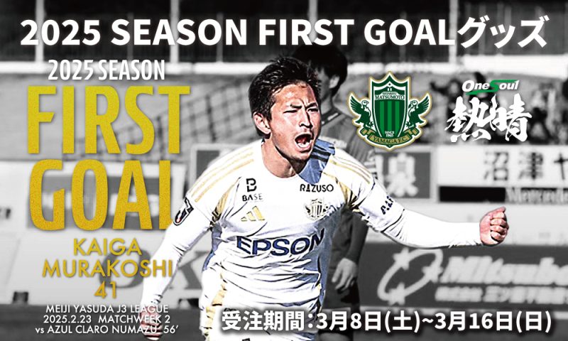先日の明治安田J3リーグ第2節 アスルクラロ沼津戦にて、村越凱光選手が記念すべき2025シーズンのチーム初ゴールを決め、これを記念したグッズの販売が決定いたしましたので、お知らせいたします。