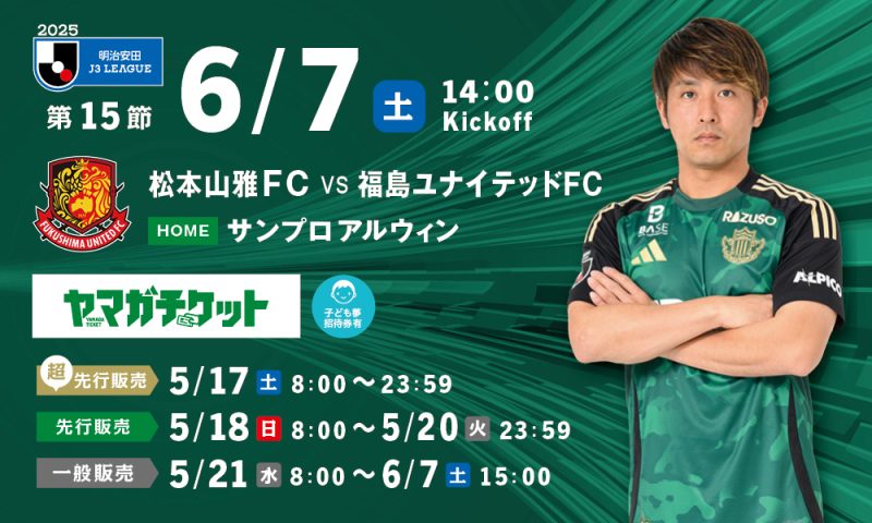 6月7日(土)に開催いたします「2025明治安田J3リーグ 第15節 福島戦(14:00キックオフ/サンプロ アルウィン)」の観戦チケット販売およびシーズンパス・招待券でのご観戦について、お知らせいたします。
