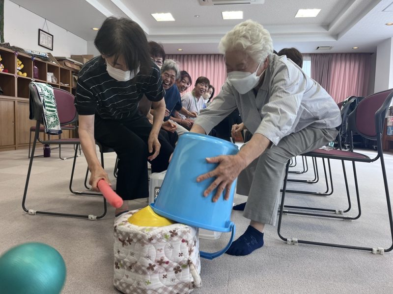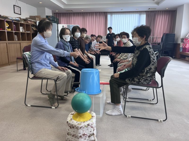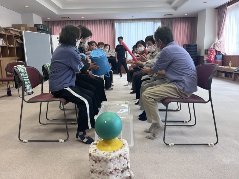 ウォーミングアップでは恒例のタオル引きじゃんけんや、バケツリレー競争などを行いました。