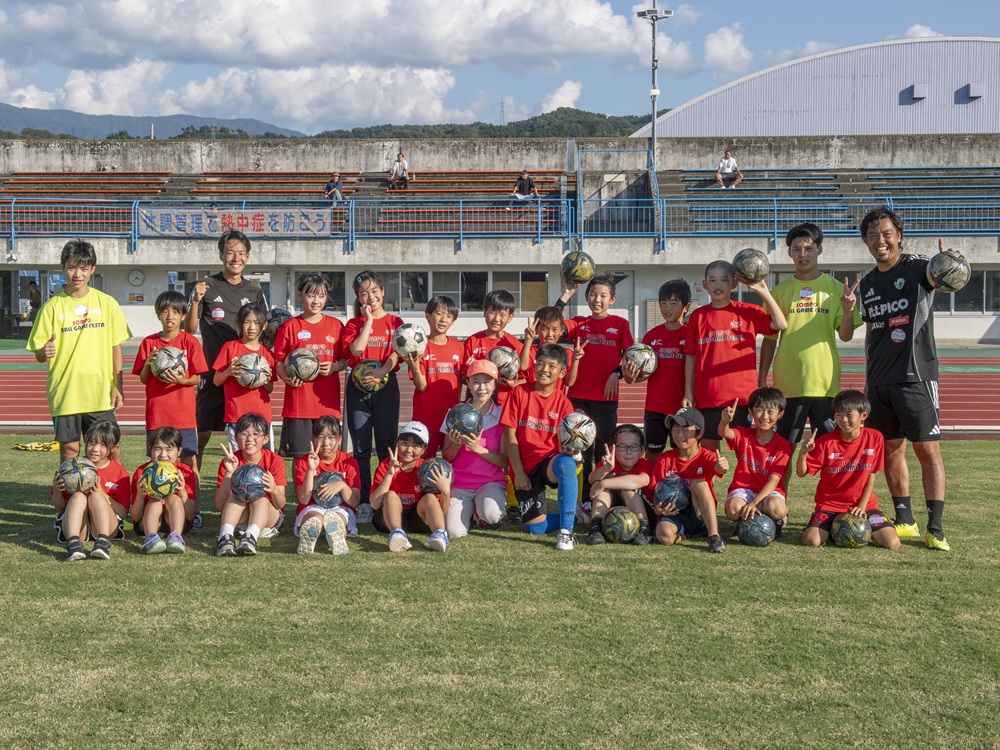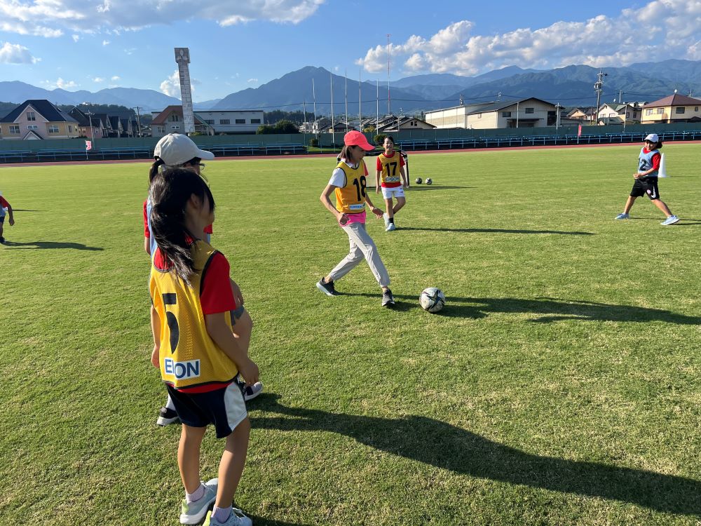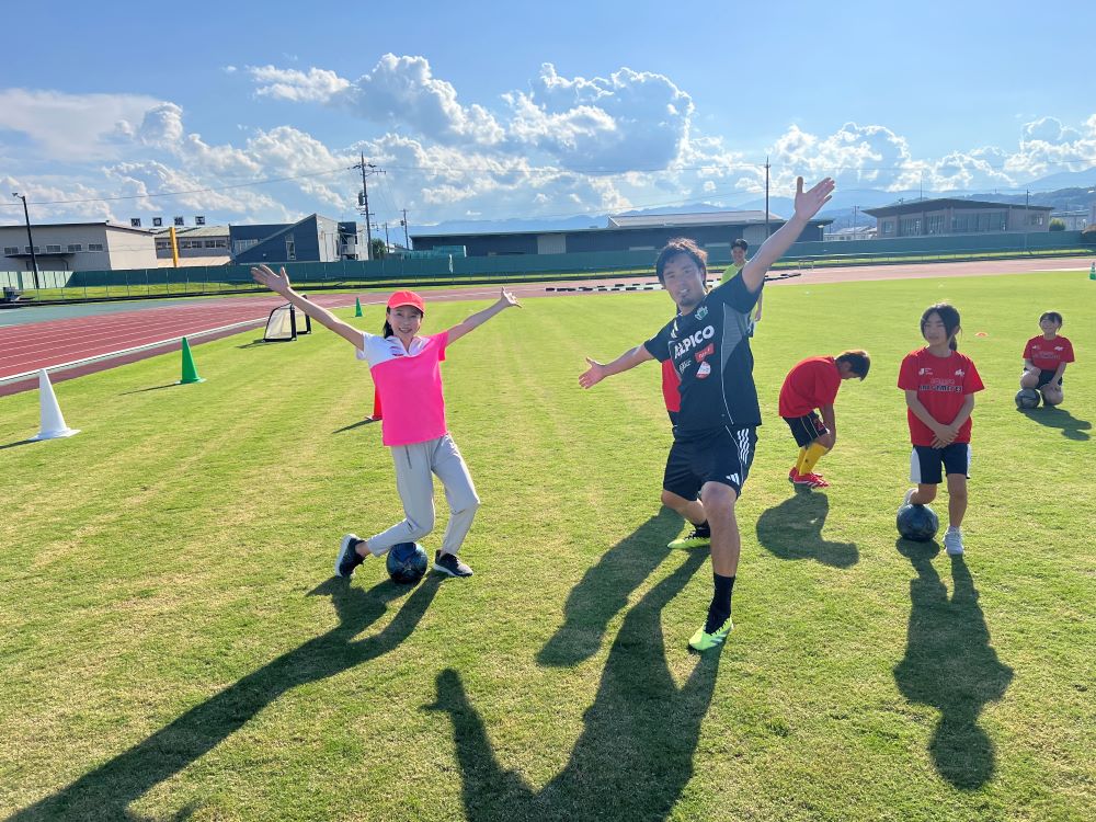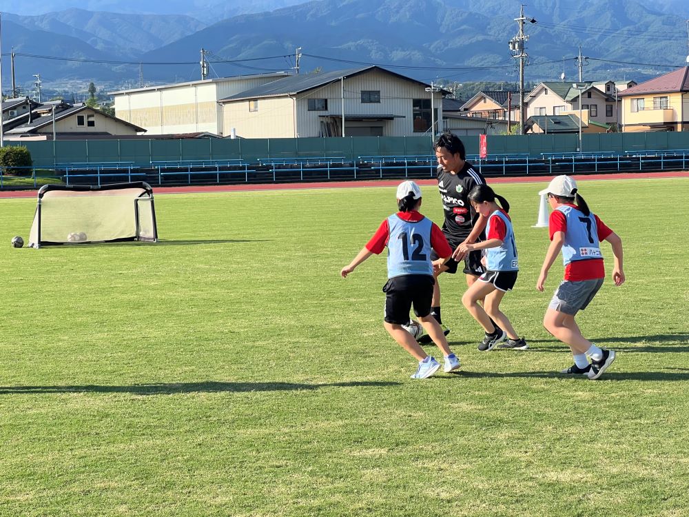 松本山雅FCではサッカーブースを担当し、スペシャルゲストの元マラソン日本代表 千葉真子さんも参加し、飯田地域にお住まいの小学校高学年、約90名の子どもたちとサッカーを行いました。