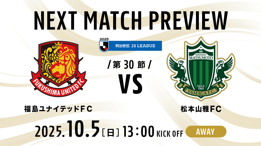 緑の旗をみちのくに立て直しながら、ラストスパートに入る一戦だ。次節の山雅はアウェイで福島と対戦。今季通算10勝8分11敗(勝点38)の10位となっており、勝点差2で追う12位の山雅は勝てばひっくり返せる。今シーズンも残り10試合。ラストスパートの刻限は迫っており、つかむべき未来は白星しかない・・・。