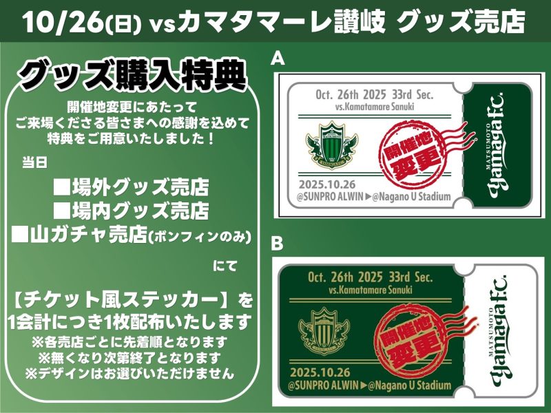 10月26日(日)に長野Uスタジアムで開催されるカマタマーレ讃岐戦で新グッズを発売いたしますので、お知らせいたします。