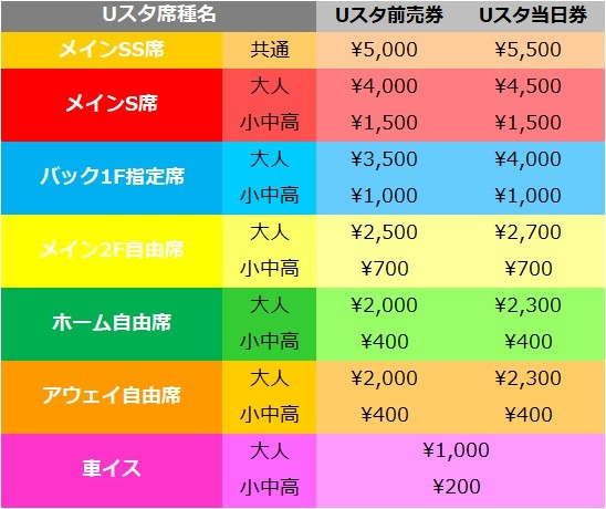 シーズンパス(B席・ホーム自由席) | 〇 | そのまま利用可。 (サンアル)B席 → (Uスタ)メイン2階自由席 |