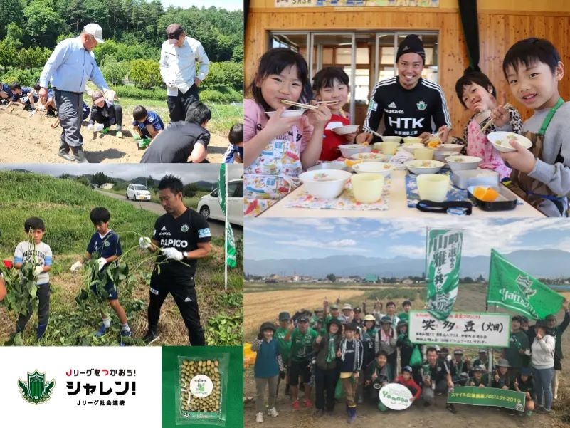遊休農地で、ホームタウン塩尻市の試験場が開発した青大豆「あやみどり」の栽培を通じ、「遊休農地の活用」・「地域住民の交流活性化」・「青少年の育成」に取り組んでいます。
