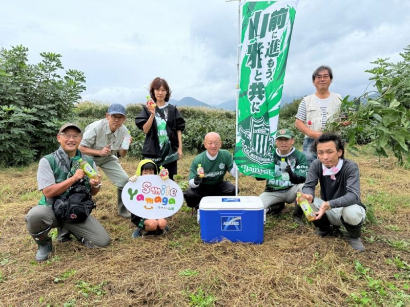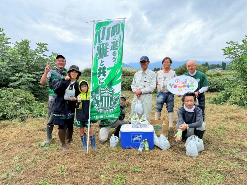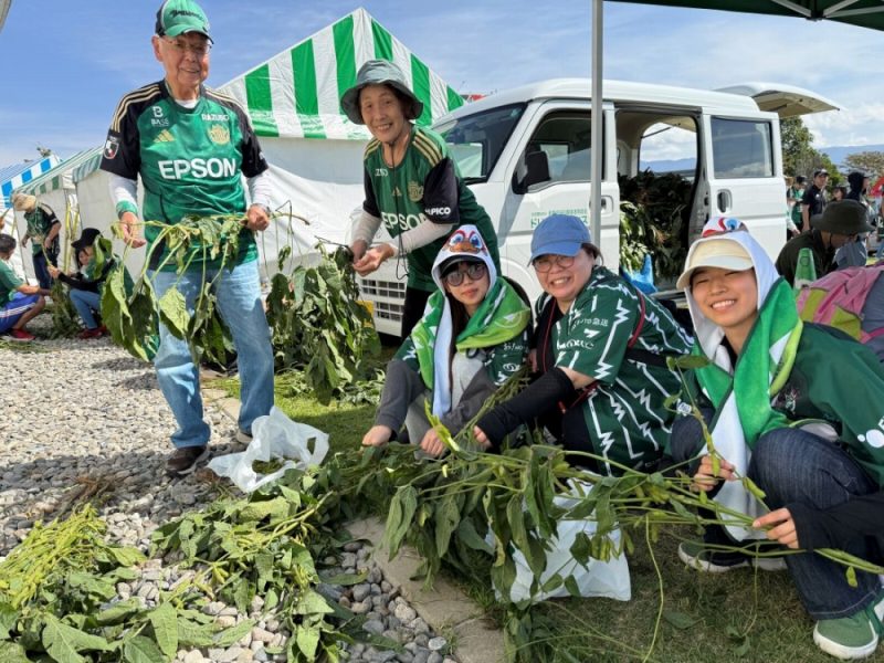「スマイル山雅農業プロジェクト」にて栽培している枝豆「あやみどり」の収穫を松本市中山、安曇野市穂高の各畑で行いました。
