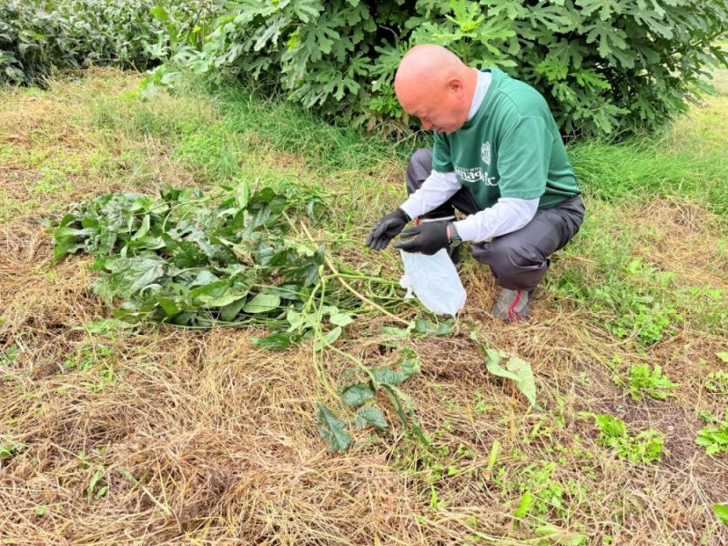安曇野市穂高の畑では、虹の村診療所の皆様と山雅後援会安曇野支部の皆様にご協力いただき収穫体験を行いました。