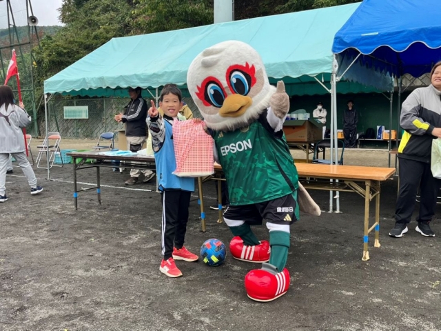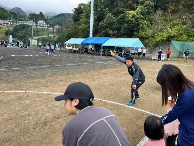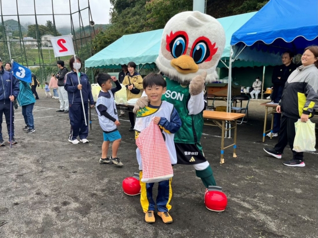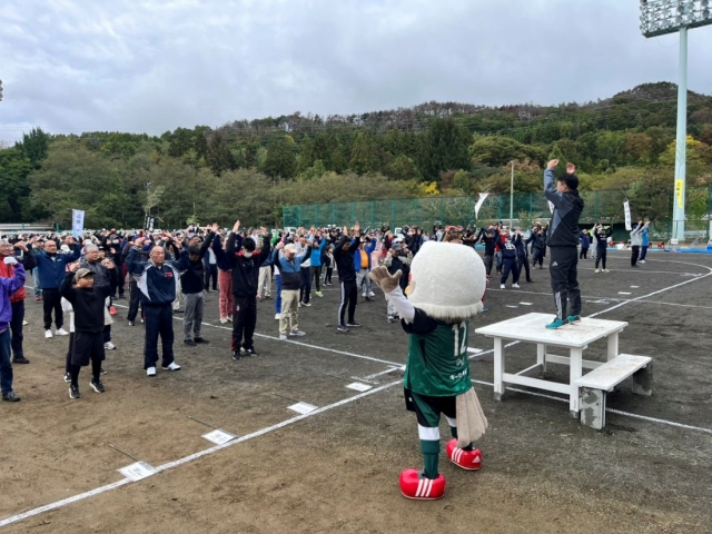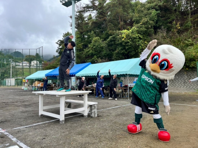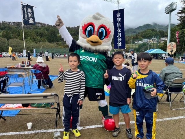 10月19日(日)麻績村総合運動場にて、「麻績村村民運動会」が開催され、鐡戸裕史総務部長兼育成部長と松本山雅FCオフィシャルマスコットのガンズくんが参加しましたので、ご報告いたします。