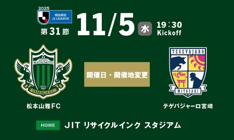10月12日(日)に開催を予定しておりました2025明治安田J3リーグ第31節松本山雅FC対テゲバジャーロ宮崎戦について、11月5日(水)にJIT リサイクルインク スタジアムにて開催することが決定しましたので、お知らせいたします。