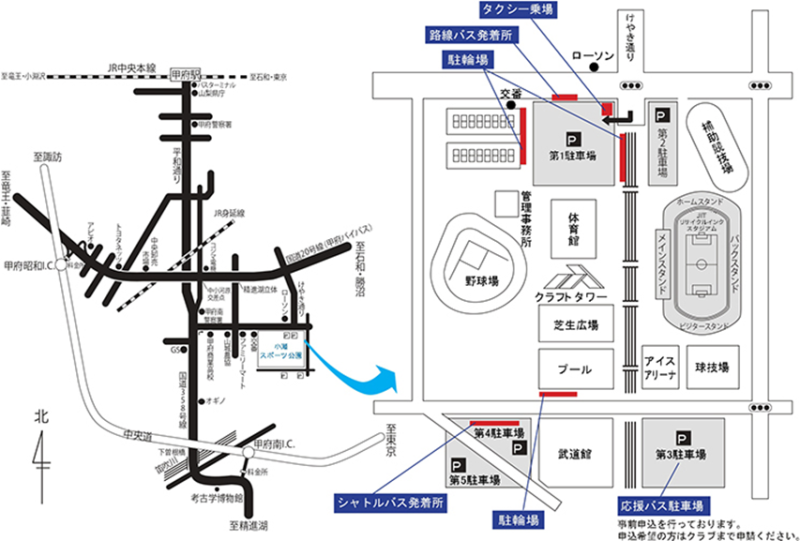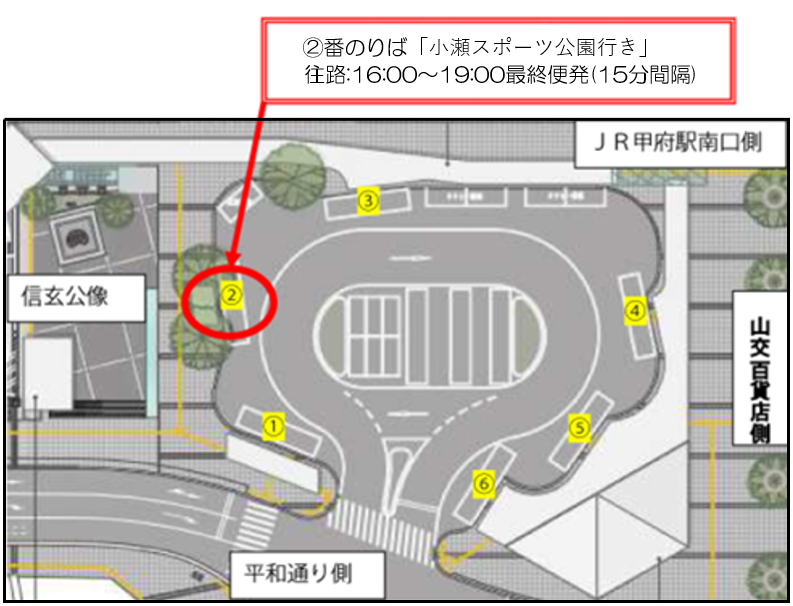 - 復路バスのりば:小瀬スポーツ公園 武道館前バスのりば