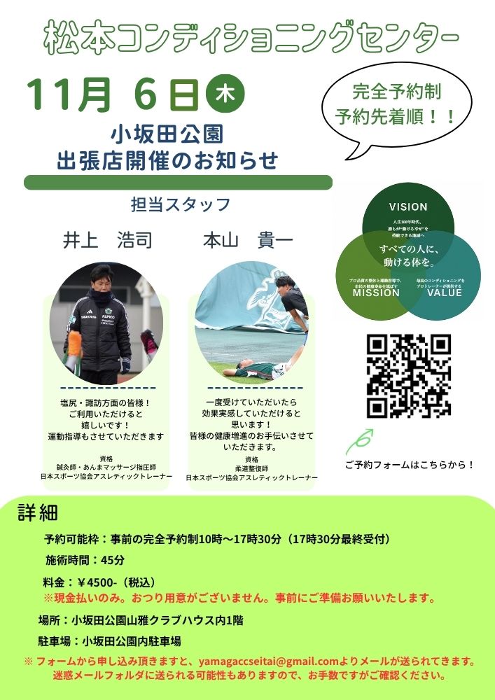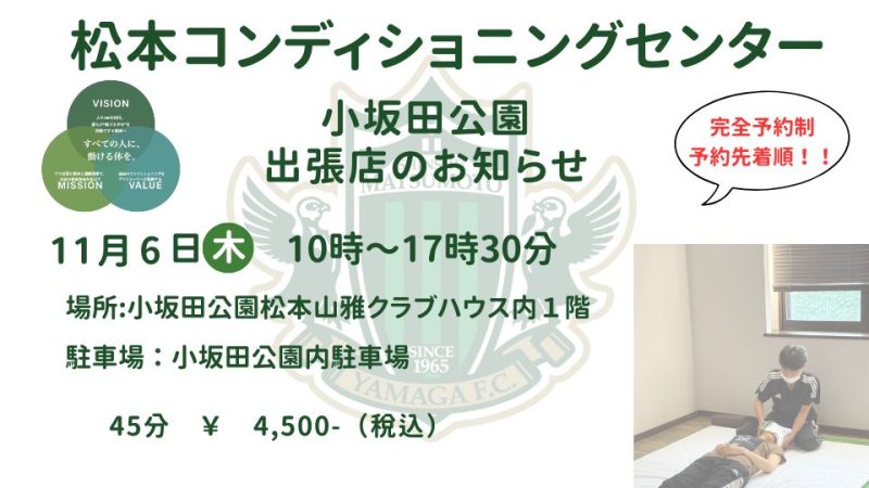 11月6日(木)に小坂田公園松本山雅FCクラブハウスにて松本コンディショニングセンターの出張店舗を開くこととなりましたのでお知らせいたします。