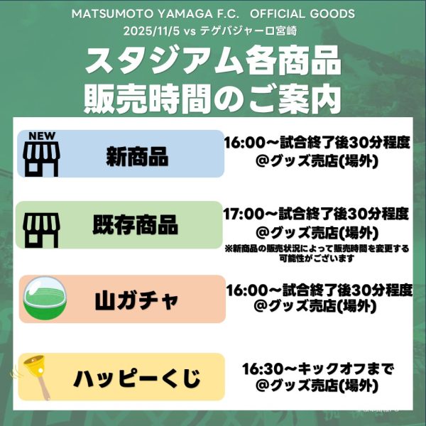 | 松本山雅FCオンラインショップ <11/5(水)10:00~> | △ ※11/5に発売後在庫が残っている場合は、 後日再入荷する場合がございます | × |