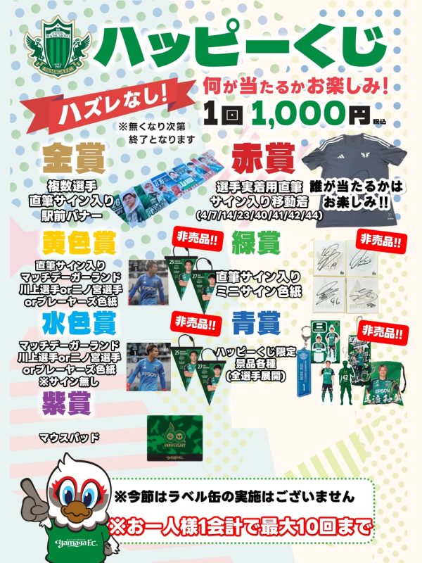 今年からハッピーくじ限定デザインのミニ色紙が景品ラインナップ入り!エンブレム2デザイン、60周年ロゴ2デザインの計4デザインの内ランダムとなります。どの選手が出るかはお楽しみ!