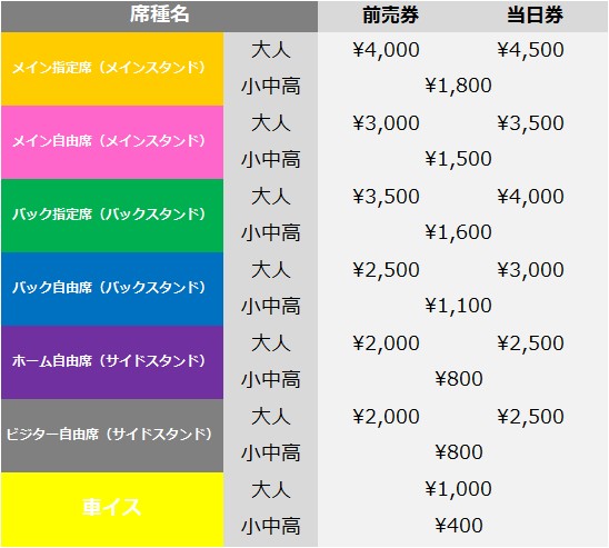| ビジター自由席 | 大人 | 2,500円 | ○ |
