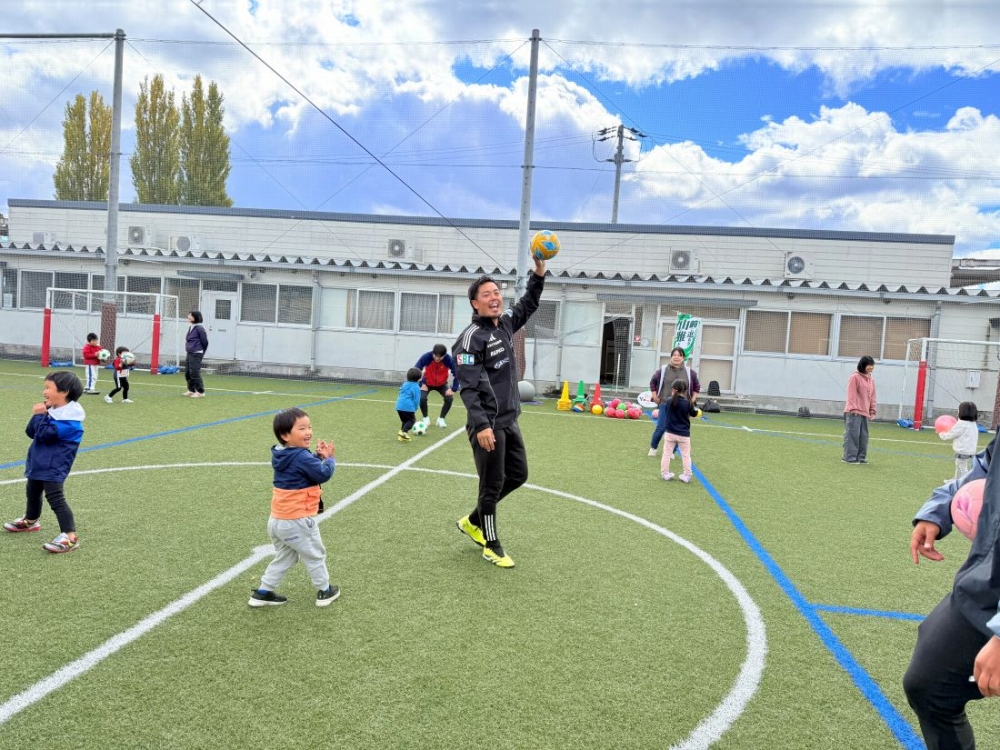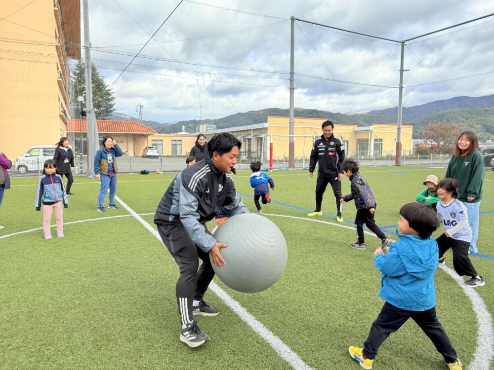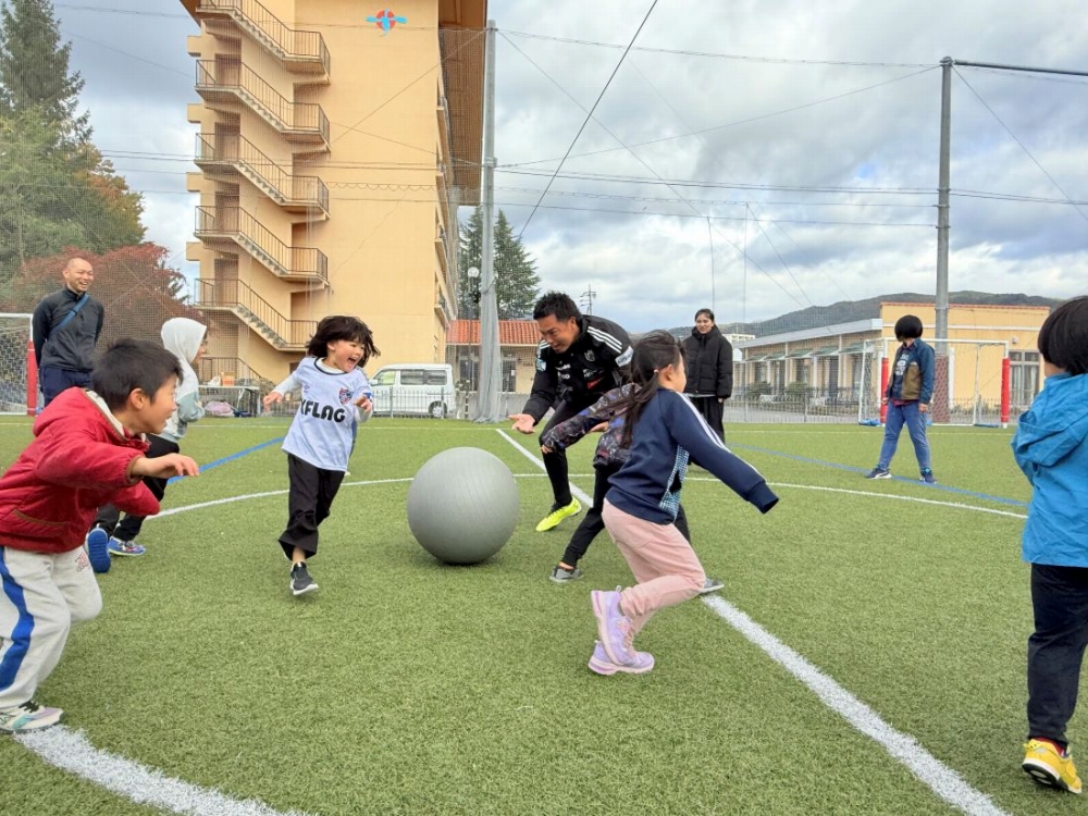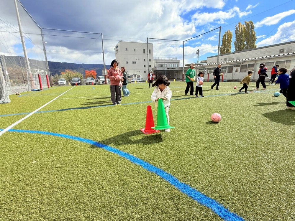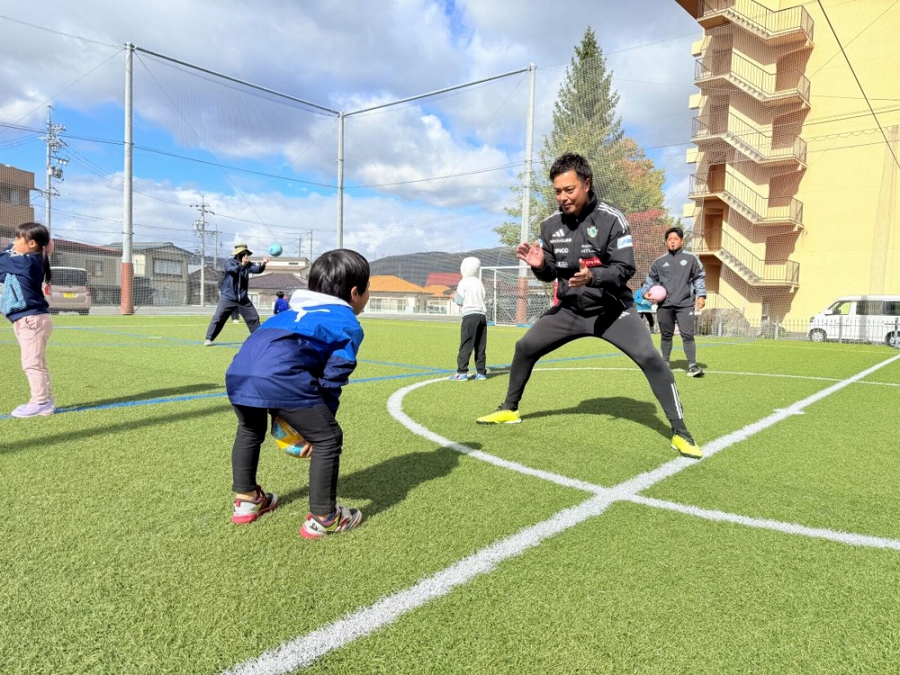 11月3日(月・祝)下諏訪健康フィールドで開催された「下諏訪健康フィールド ボールゲーム教室」(主催:下諏訪町)に、松本山雅FCよりクラブプロモーション担当の片山真人と松本山雅FCスタッフが参加しました。
