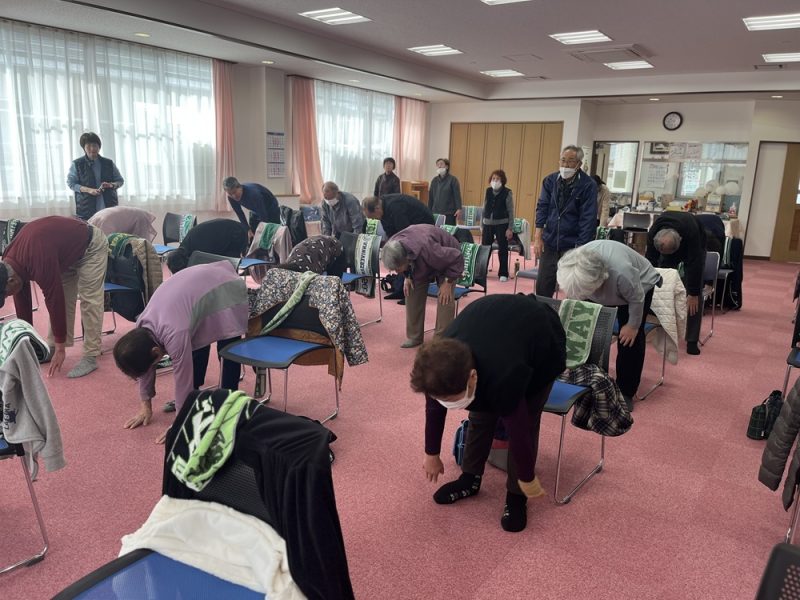 今回は鎌田地区にお住いの30名の方にご参加いただき、初参加の方が非常に多くウォーミングアップではじんわり汗がでるような軽い運動を行いました。