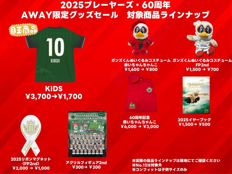 2025プレーヤーズグッズの一部や60周年記念グッズの他、今節からアウェイ限定グッズもラインナップ入り!お得に手に入れられるチャンスですので、ぜひご来店ください☆