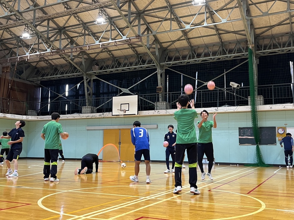 今回の授業では、「サッカーをベースとした運動の理解と発展」をテーマに、ボールフィーリングや動きづくりなどの実技を中心に行いました。