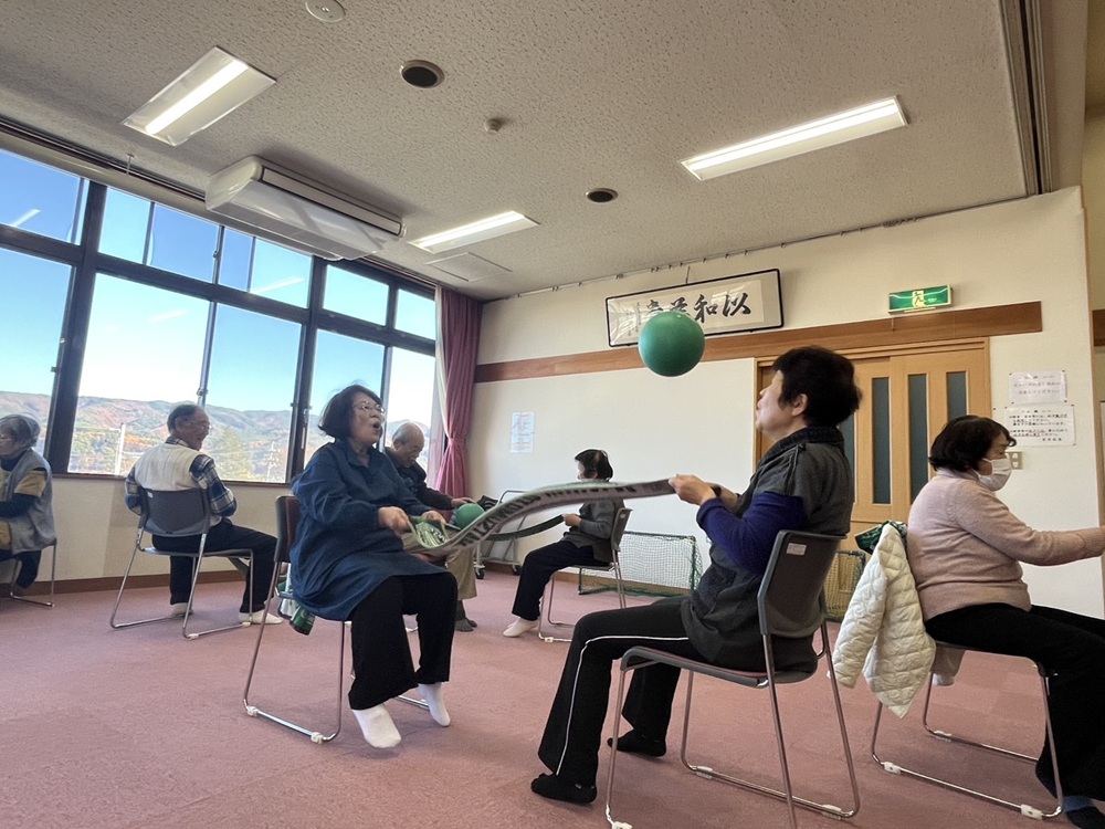今回は辰野町宮木地区にお住いの方々にご参加いただき、脳トレやタオルマフラーと柔らかいボールを使いながら運動を行いました。