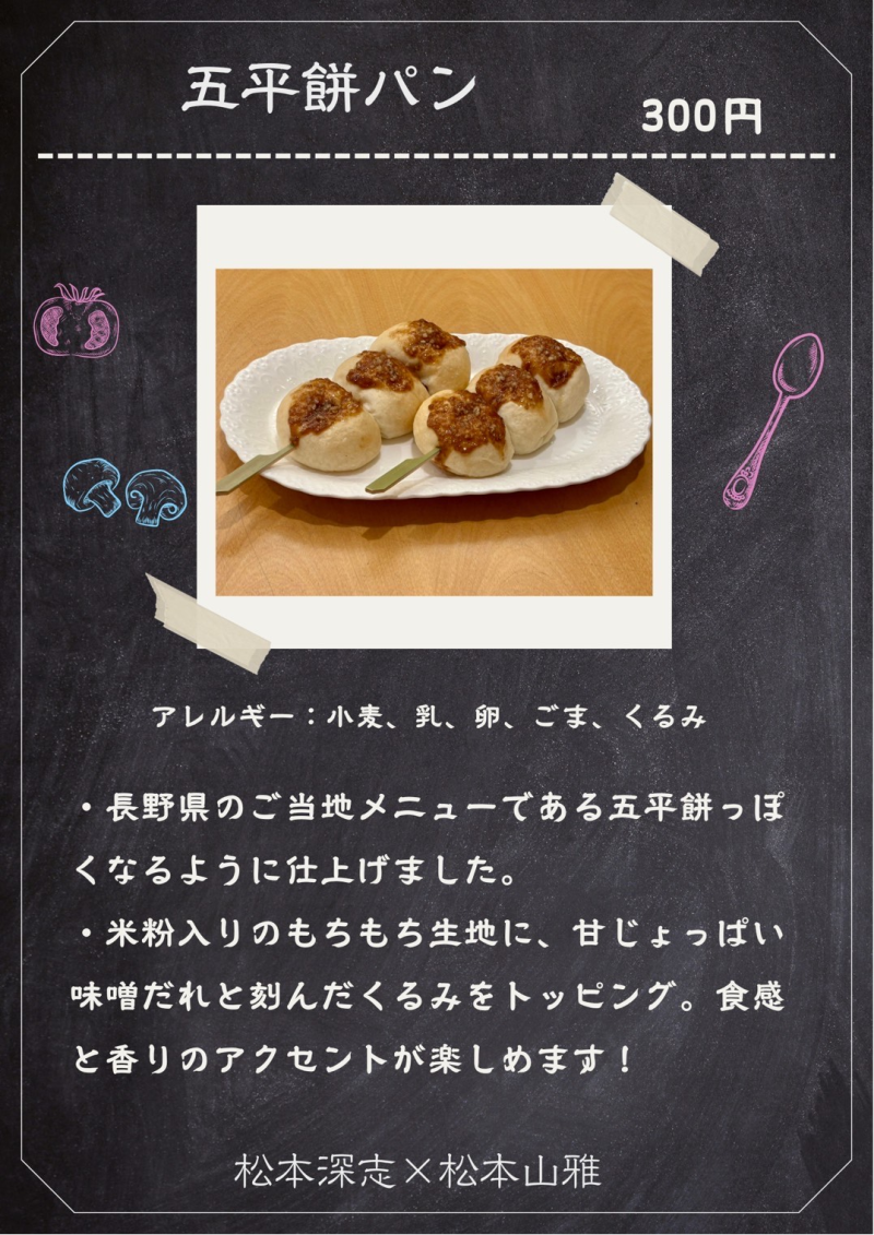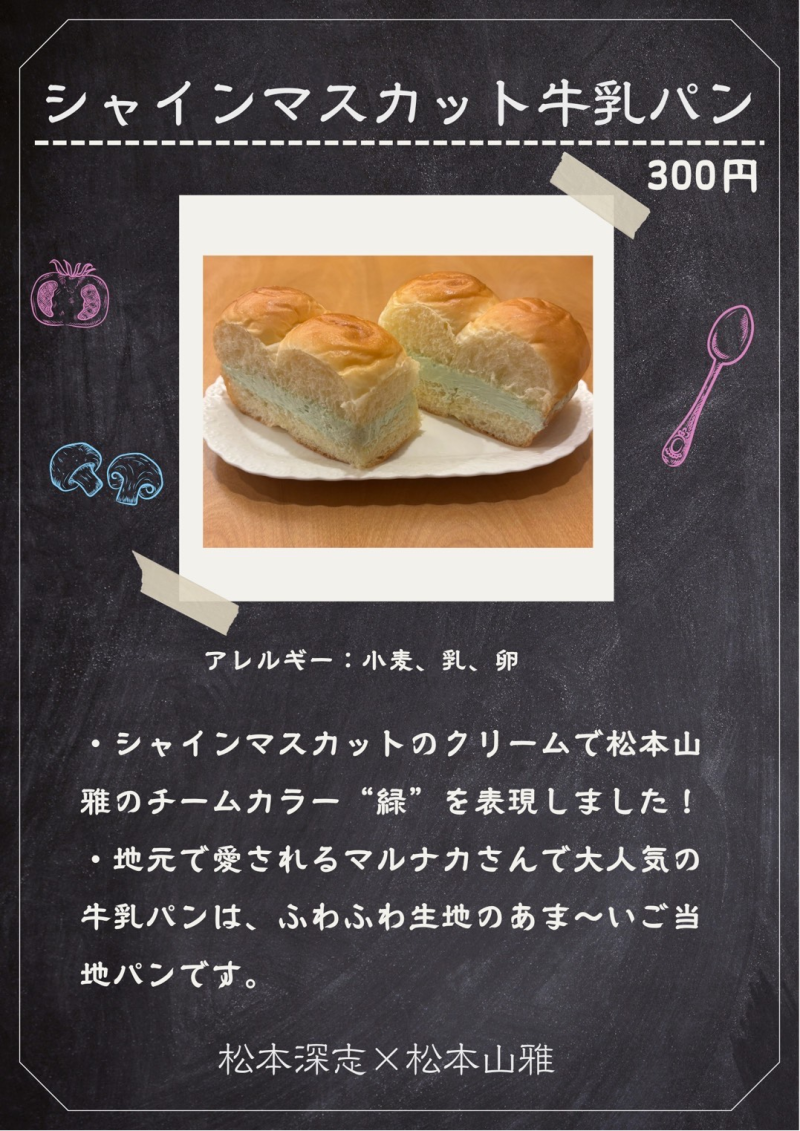 今回はその活動の一環として、地元のパン屋であるパントリーマルナカさんと協力し、松本地域をイメージしたオリジナルパン制作&販売と松本山雅さんと協力し選手のおすすめをまとめたオリジナル松本マップを制作&配布しています。