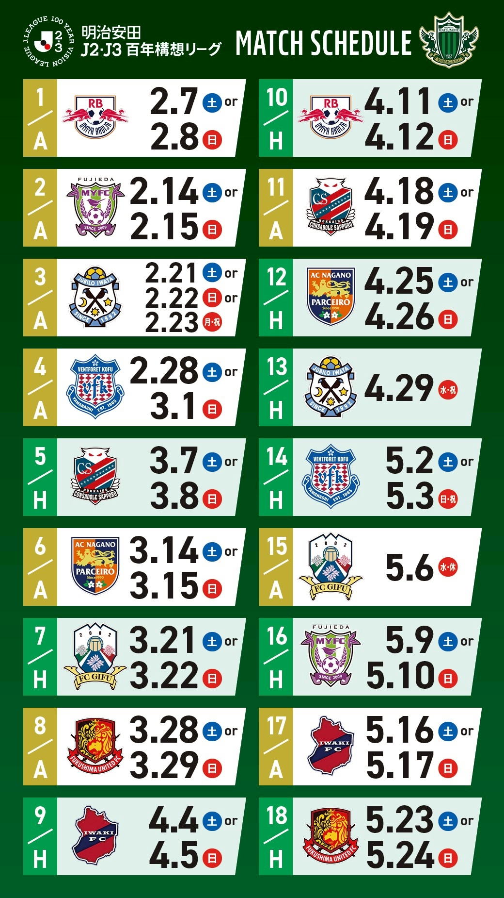 松本山雅FCは【明治安田J2・J3百年構想リーグ EAST-Bグループ】を戦います。