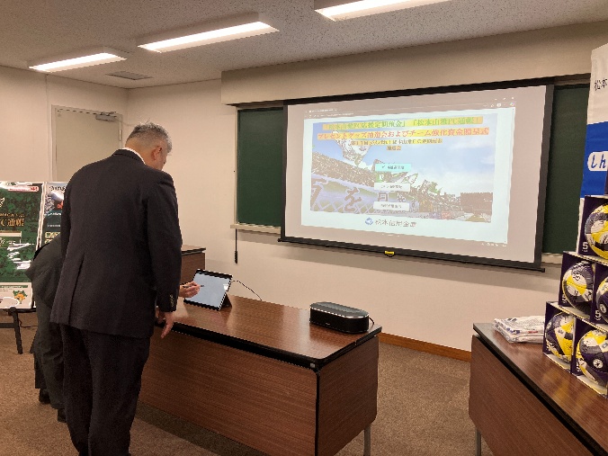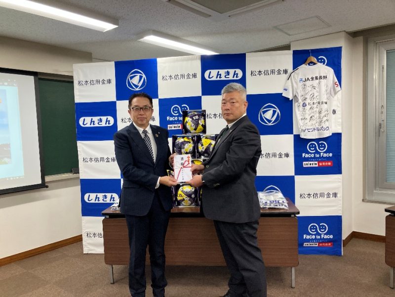 12月25日(木)に行われた贈呈式では、松本信用金庫 理事長 鶴見 明夫様より目録の贈呈があり、株式会社松本山雅 柄澤取締役営業部長が代表してお受け取りいたしました。