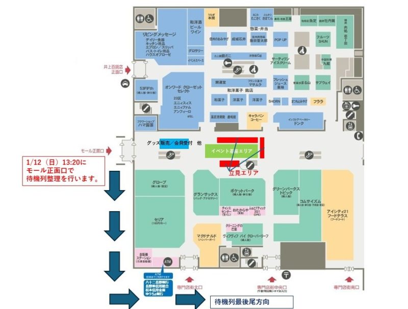 - 200番までの方が当選となり、1月17日(土)13:20にアイシティ21″モール正面口”で待機列整理を行いますので、抽選番号をスタッフにお見せください。