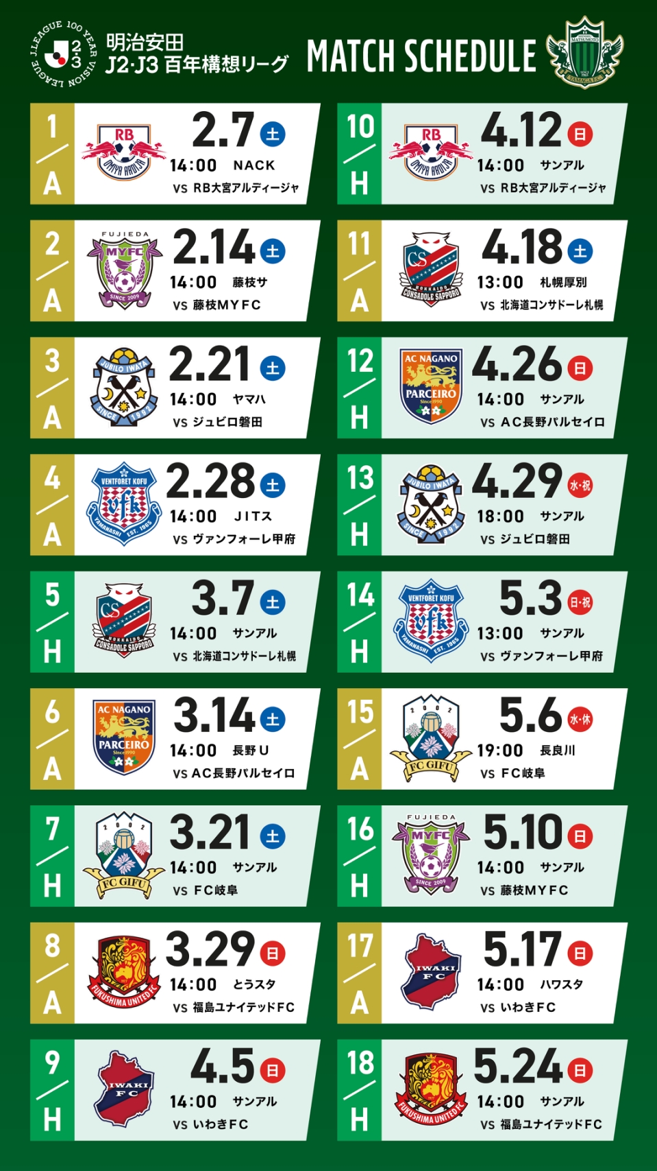 明治安田Jリーグ百年構想リーグ 日程発表のお知らせ 2026.01.09 クラブ 本日Jリーグより、明治安田Jリーグ百年構想リーグの試合日程が発表されましたのでお知らせいたします。 試合スケジュール(A4サイズ:PDF) 明治安田Jリーグ百年構想リーグ 松本山雅FC試合日程はコチラ Jリーグからの発表はコチラ(J LEAGUE.jp) 1/17(土)「松本山雅FC 2026キックオフイベント」詳細について 3/7(土)コンサドーレ札幌戦にて「熱狂開幕ブランケット」を先着9,000名様にプレゼント!
